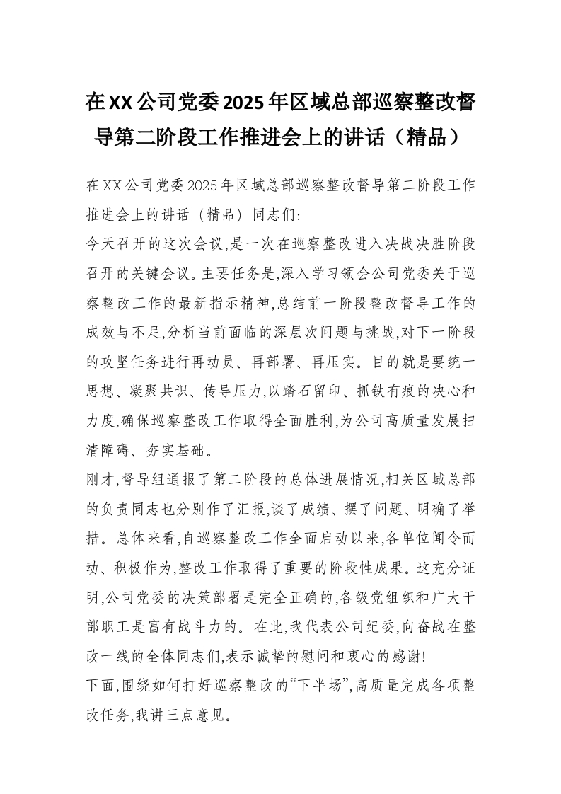 首页精选范文在XX公司党委2025年区域总部巡察整改督导第二阶段工作推进会上的讲话(精品)