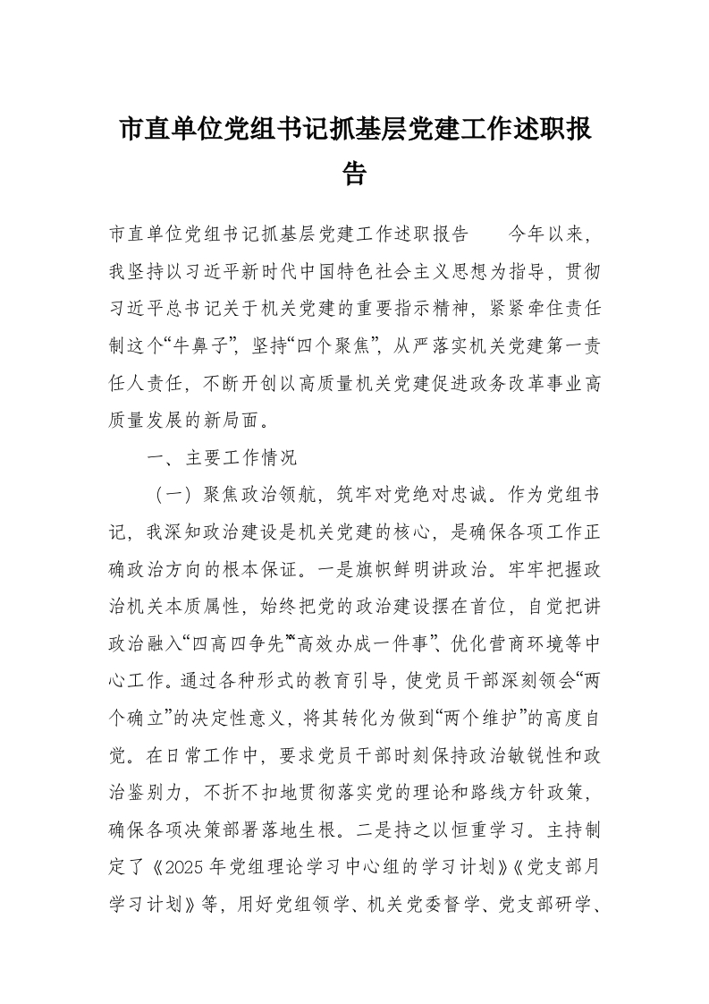 首页精选范文市直单位党组书记抓基层党建工作述职报告