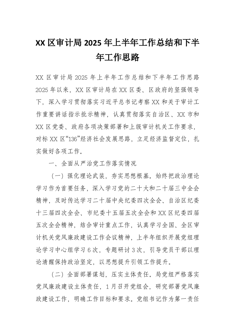 XX区审计局2025年上半年工作总结和下半年工作思路