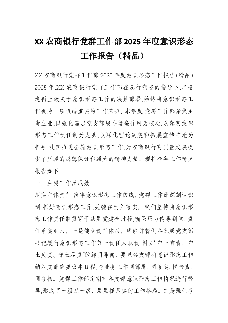 XX农商银行党群工作部2025年度意识形态工作报告(精品)
