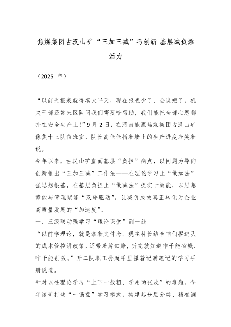 首页工作文档焦煤集团古汉山矿“三加三减”巧创新基层减负添活力_副本
