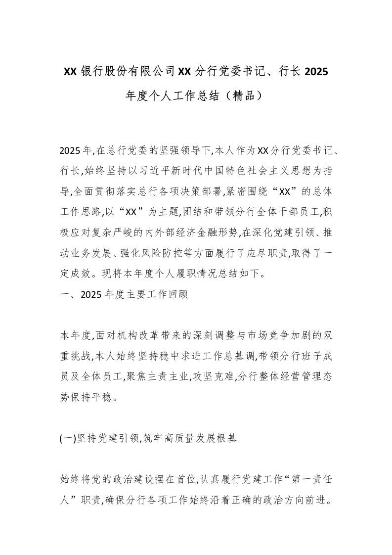 XX银行股份有限公司XX分行党委书记、行长2025年度个人工作总结(精品)_副本