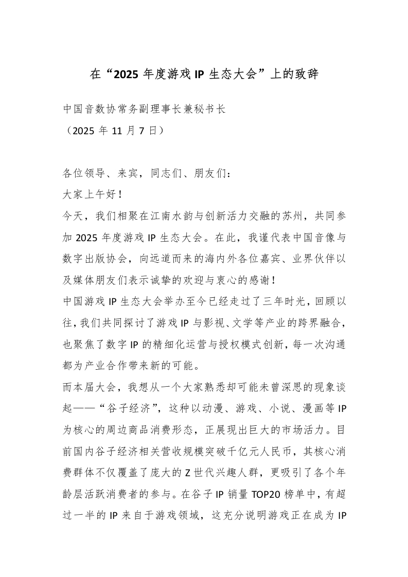 在“2025年度游戏IP生态大会”上的致辞_副本