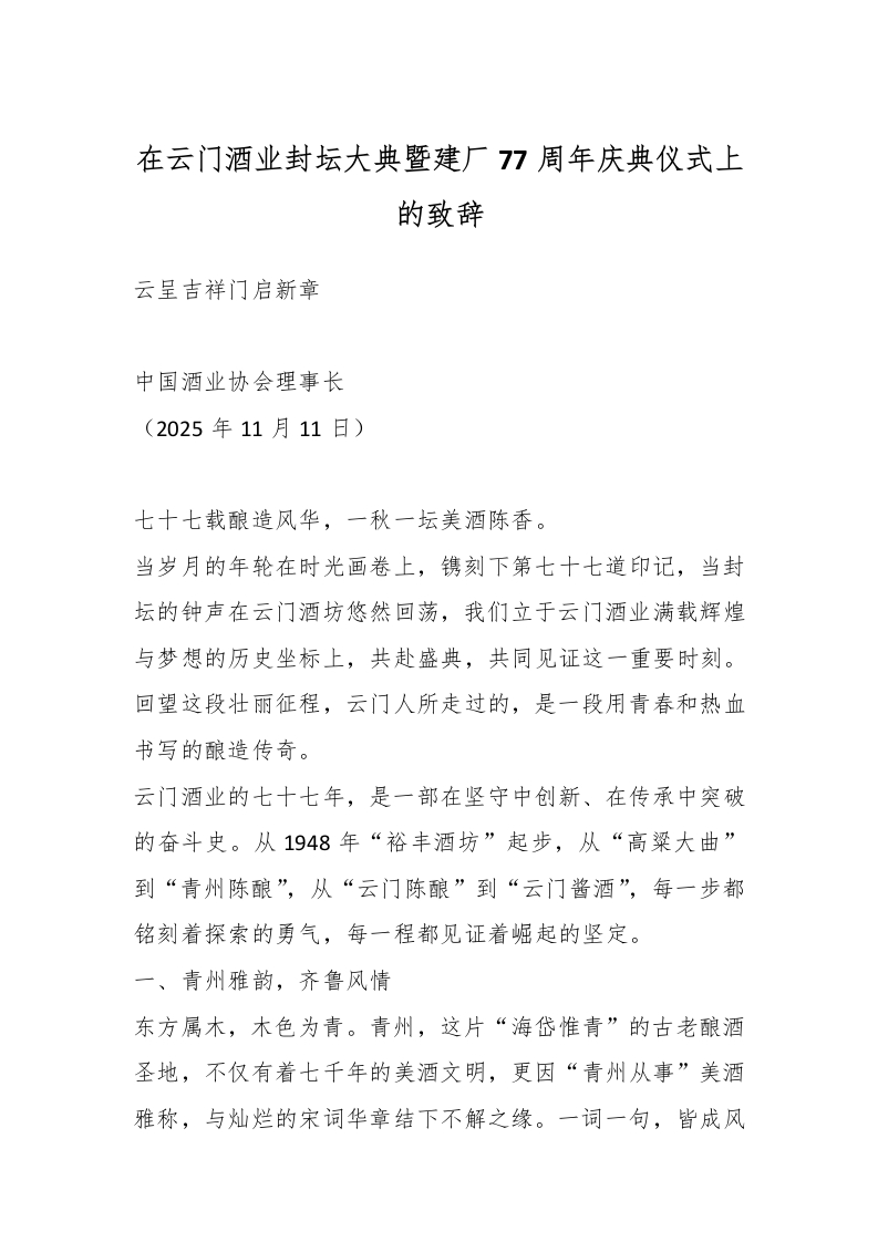 在云门酒业封坛大典暨建厂77周年庆典仪式上的致辞_副本