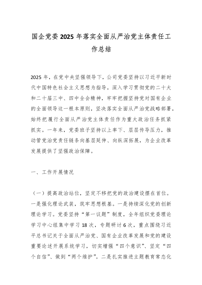 首页工作文档国企党委2025年落实全面从严治党主体责任工作总结_副本