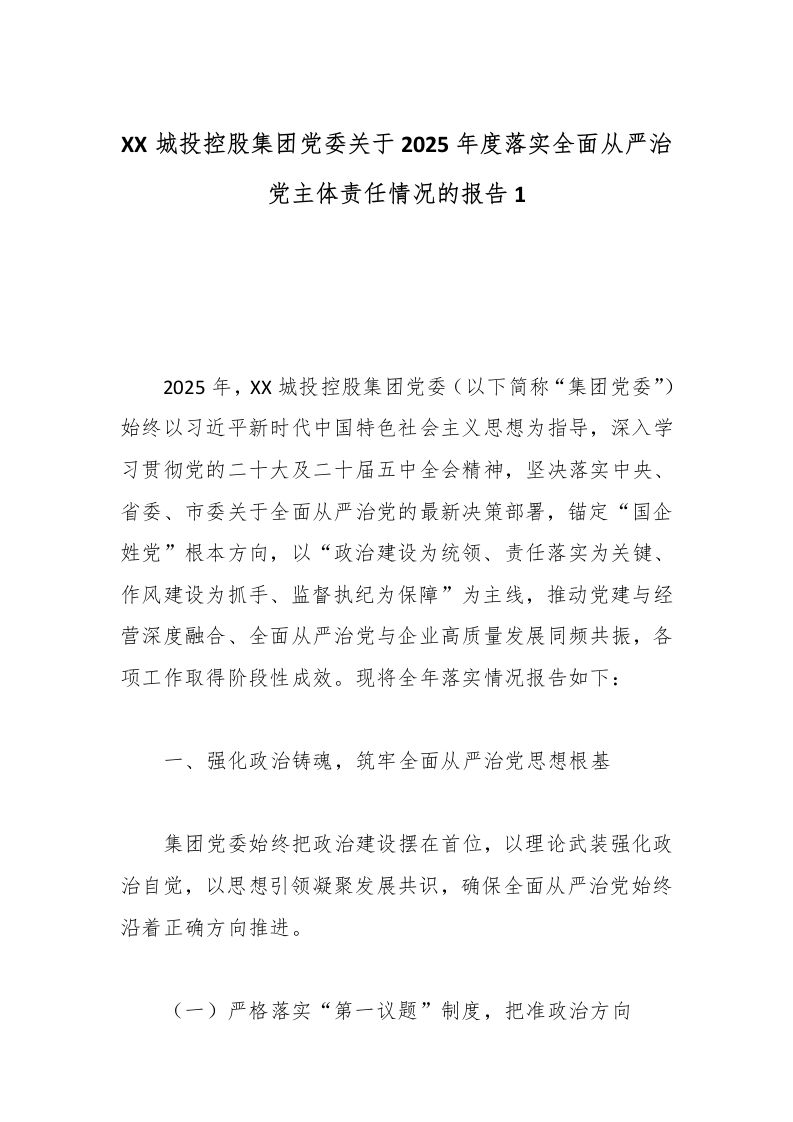 XX城投控股集团党委关于2025年度落实全面从严治党主体责任情况的报告1_副本