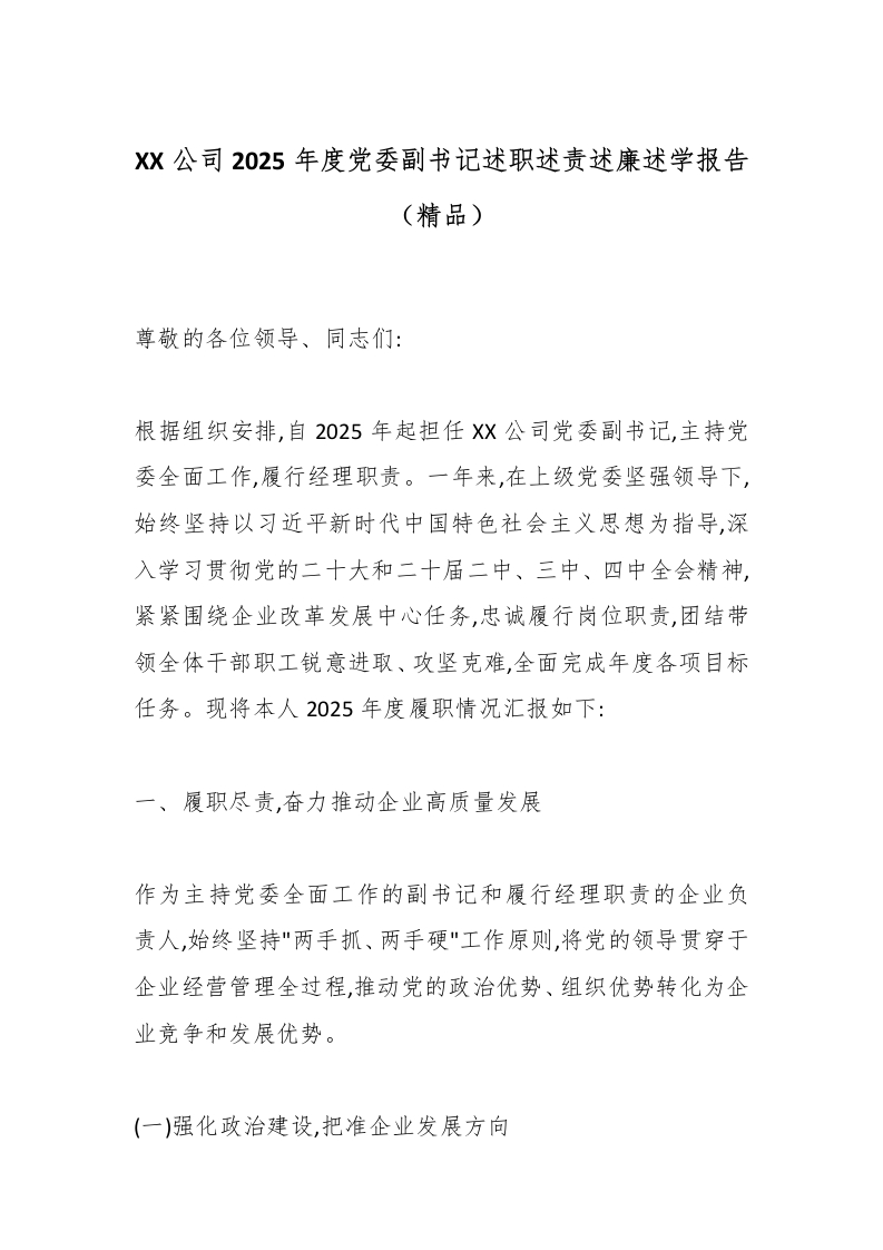 XX公司2025年度党委副书记述职述责述廉述学报告(精品)_副本