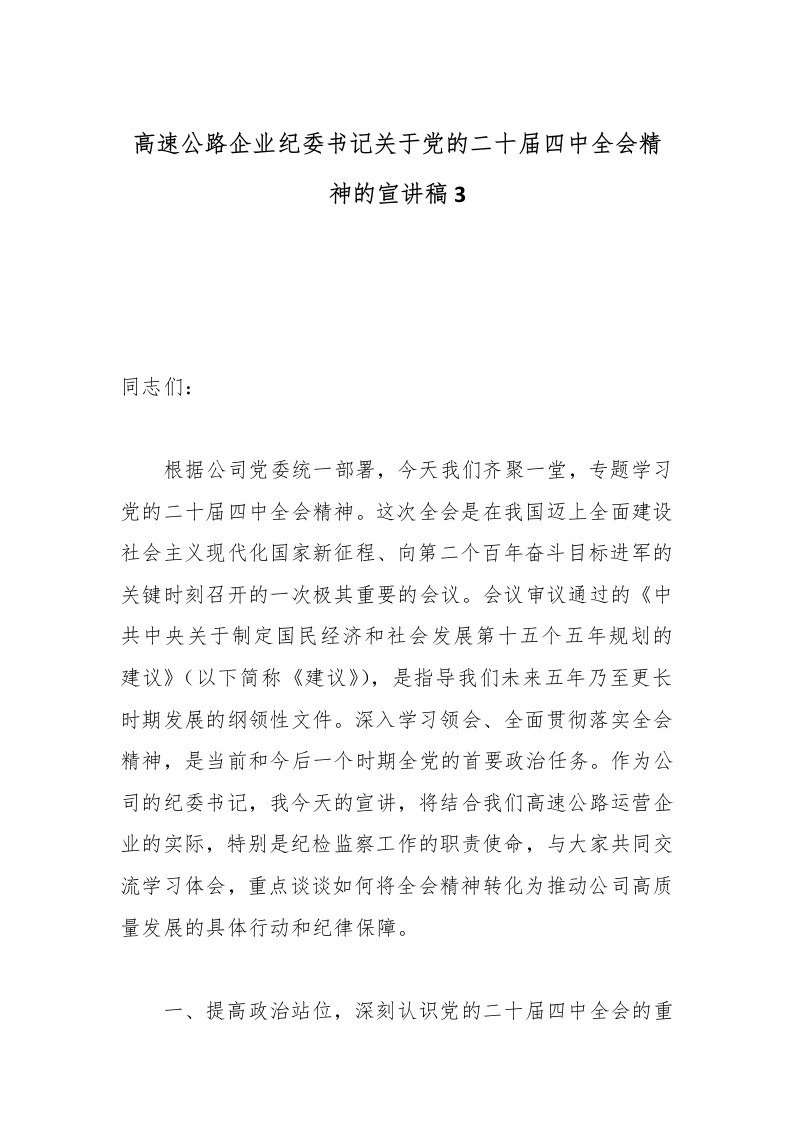 首页工作文档高速公路企业纪委书记关于党的二十届四中***精神的宣讲稿3_副本