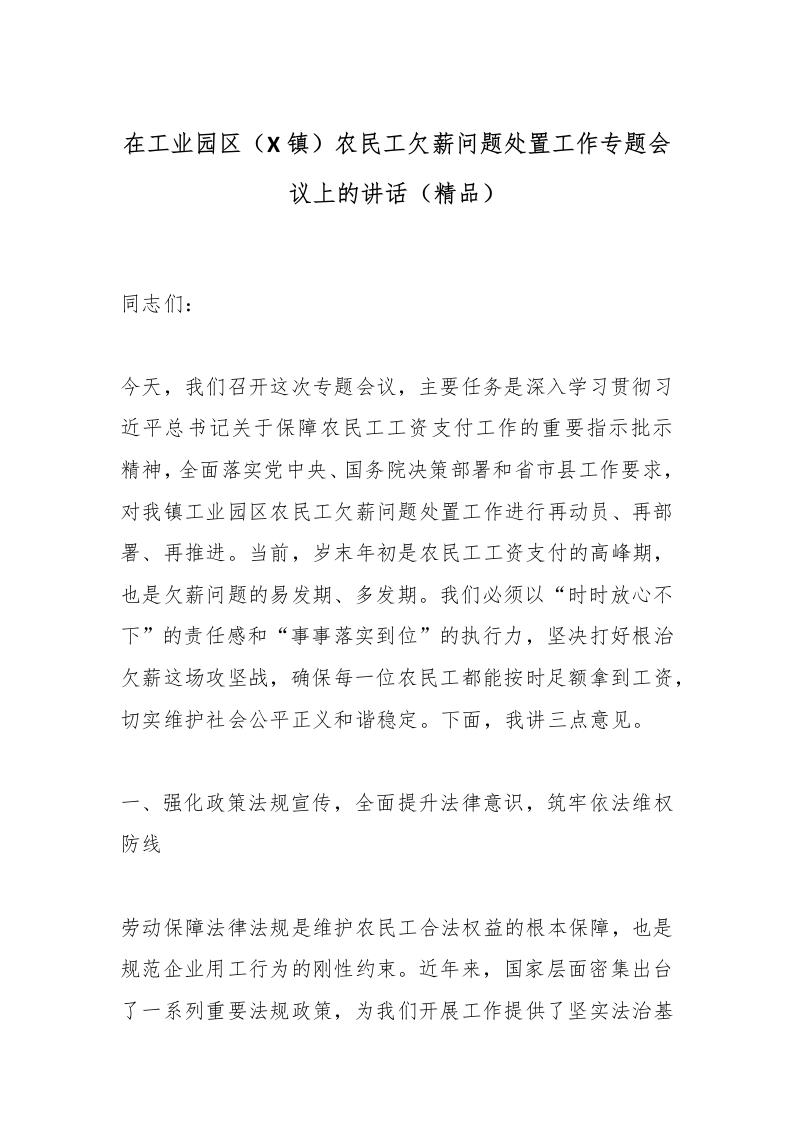 首页工作文档在工业园区(X镇)农民工欠薪问题处置工作专题会议上的讲话(精品)_副本