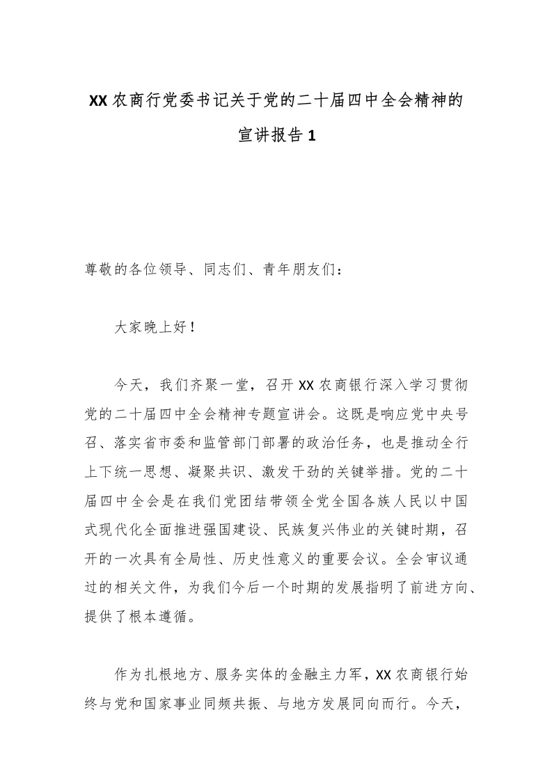 XX农商行党委书记关于党的二十届四中***精神的宣讲报告1_副本