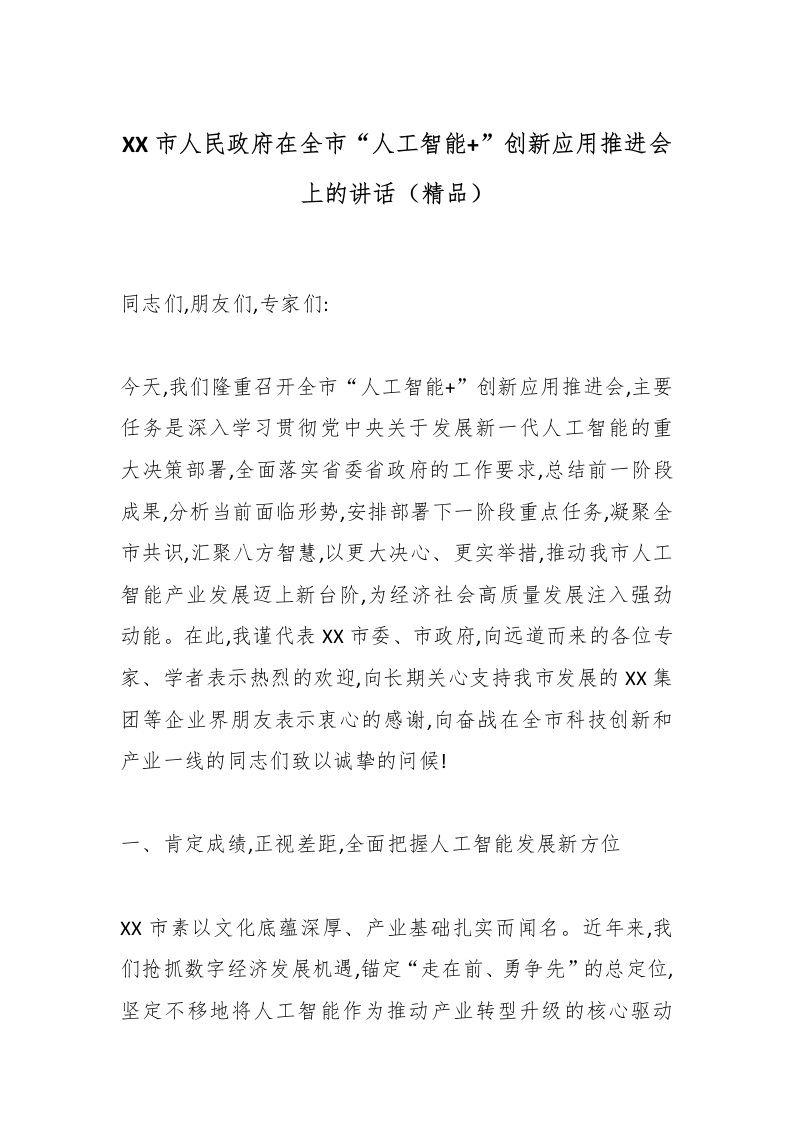XX市人民***在全市“人工智能+”创新应用推进会上的讲话(精品)_副本
