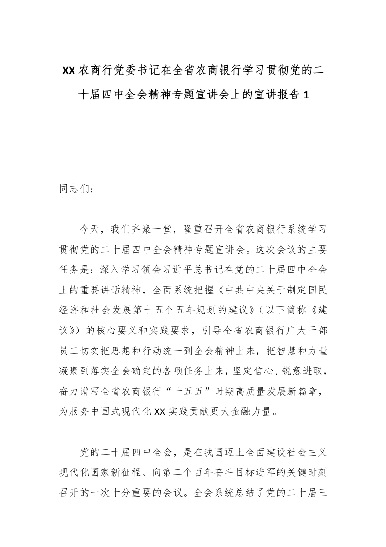 XX农商行党委书记在全省农商银行学习贯彻党的二十届四中***精神专题宣讲会上的宣讲报告1_副本