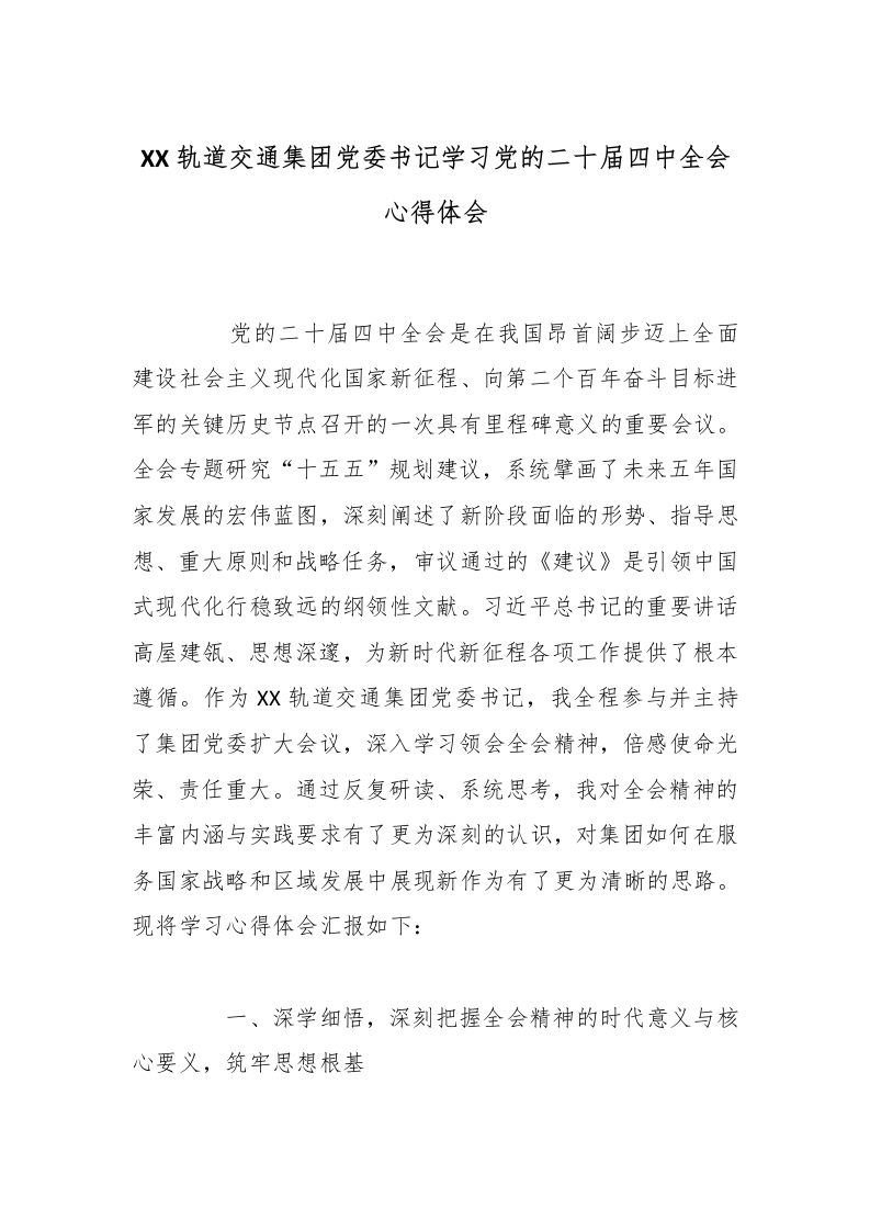 XX轨道交通集团党委书记学习党的二十届四中***心得体会_副本