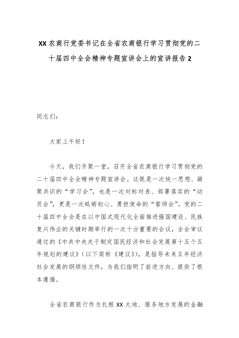 XX农商行党委书记在全省农商银行学习贯彻党的二十届四中***精神专题宣讲会上的宣讲报告2_副本