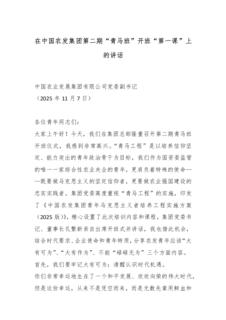 在中国农发集团第二期“青马班”开班“第一课”上的讲话_副本