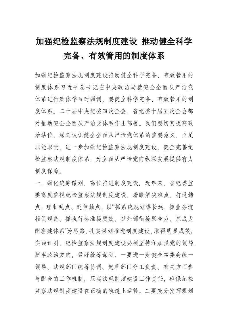 加强纪检监察法规制度建设 推动健全科学完备、有效管用的制度体系