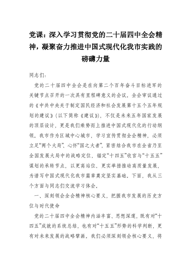 党课:深入学习贯彻党的二十届四中***精神,凝聚奋力推进中国式现代化我市实践的磅礴力量