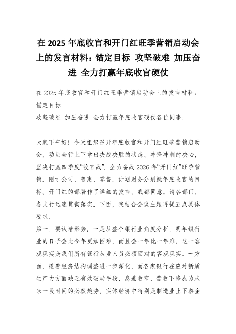 首页讲课讲稿在2025年底收官和开门红旺季营销启动会上的发言材料:锚定目标 攻坚破难 加压奋进 全力打赢年底收官硬仗