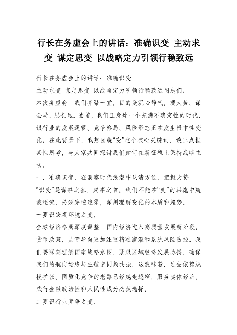 首页讲课讲稿行长在务虚会上的讲话:准确识变 主动求变 谋定思变 以战略定力引领行稳致远