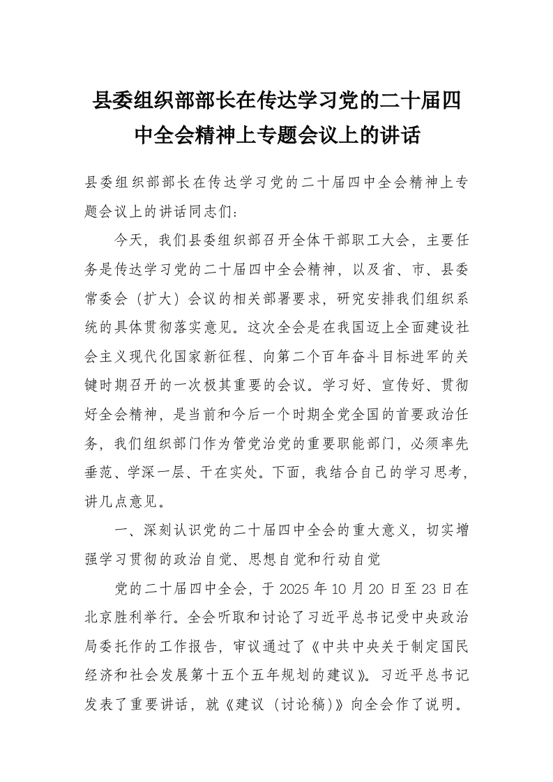 首页讲课讲稿县委组织部部长在传达学习党的二十届四中***精神上专题会议上的讲话