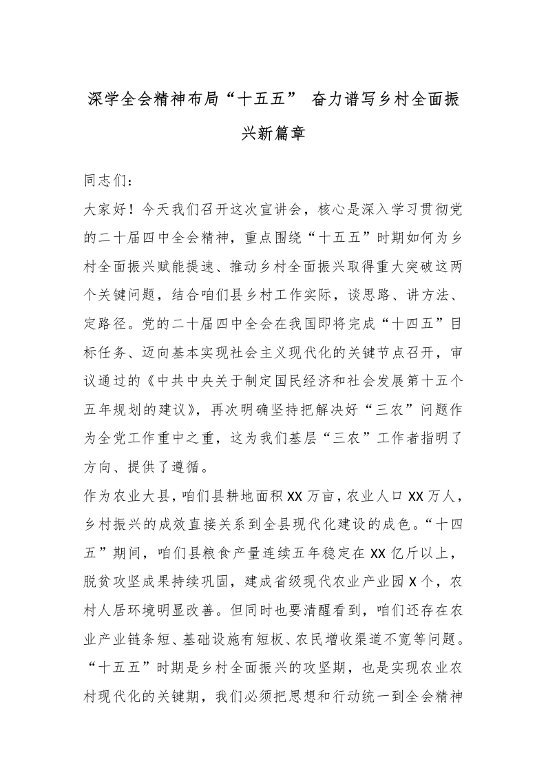 首页讲课讲稿深学***精神布局“十五五” 奋力谱写乡村全面振兴新篇章