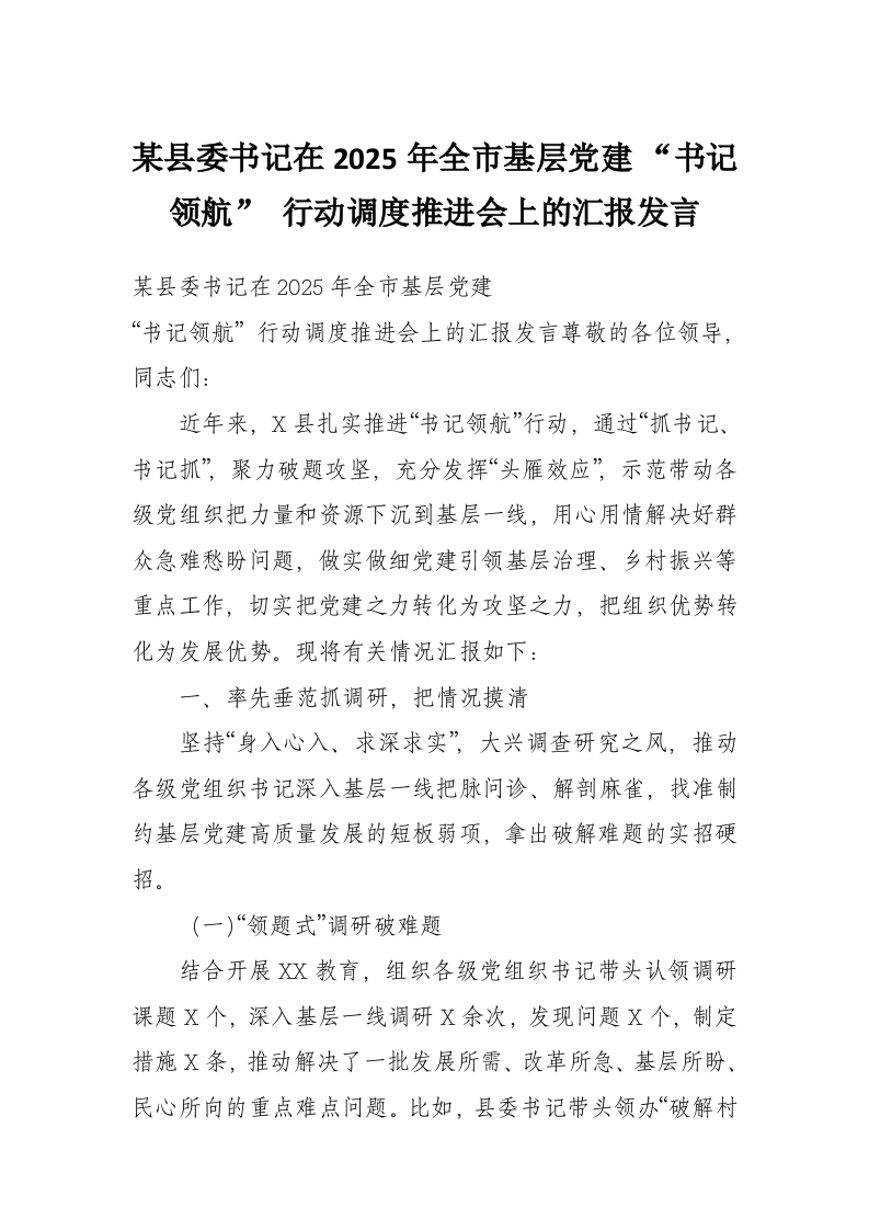 某县委书记在2025年全市基层党建 “书记领航” 行动调度推进会上的汇报发言