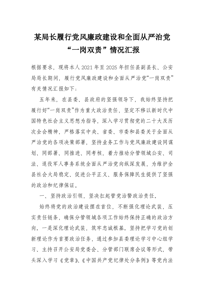 首页讲课讲稿某局长履行党风廉政建设和全面从严治党“一岗双责”情况汇报