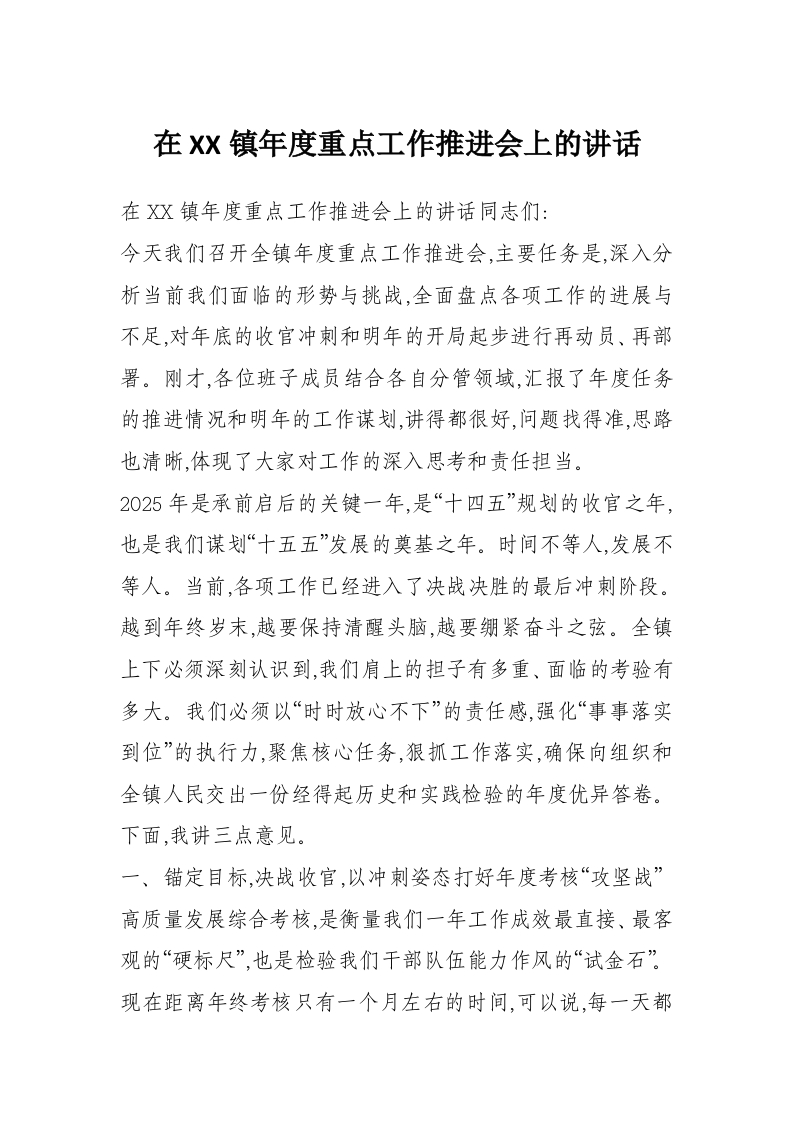 在XX镇年度重点工作推进会上的讲话