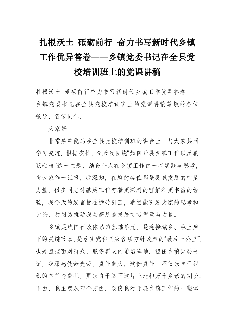 扎根沃土 砥砺前行 奋力书写新时代乡镇工作优异答卷——乡镇党委书记在全县党校培训班上的党课讲稿