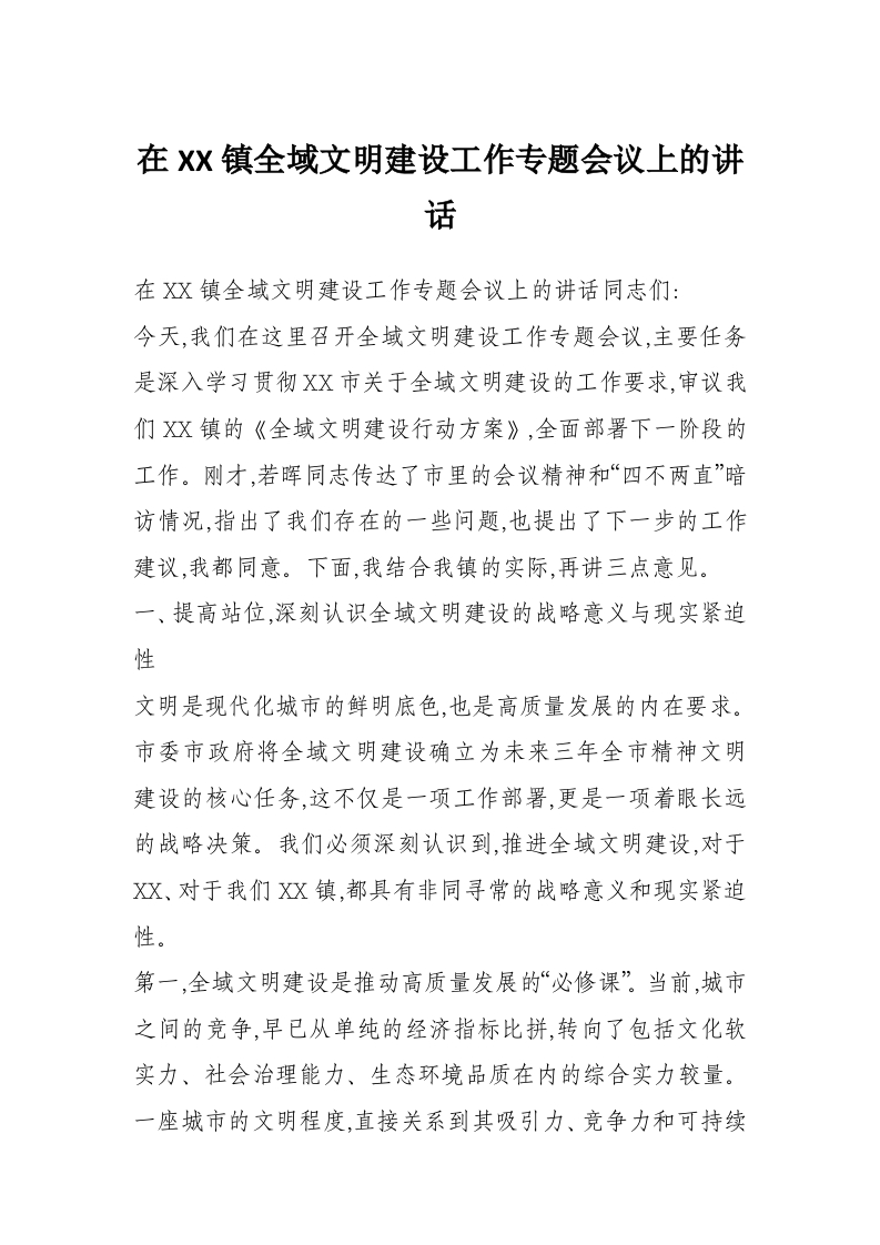 首页工作文档在XX镇全域文明建设工作专题会议上的讲话