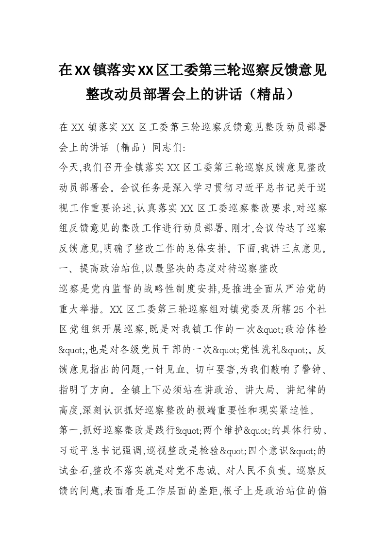 在XX镇落实XX区工委第三轮巡察反馈意见整改动员部署会上的讲话(精品)