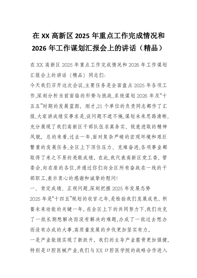 在XX高新区2025年重点工作完成情况和2026年工作谋划汇报会上的讲话(精品)