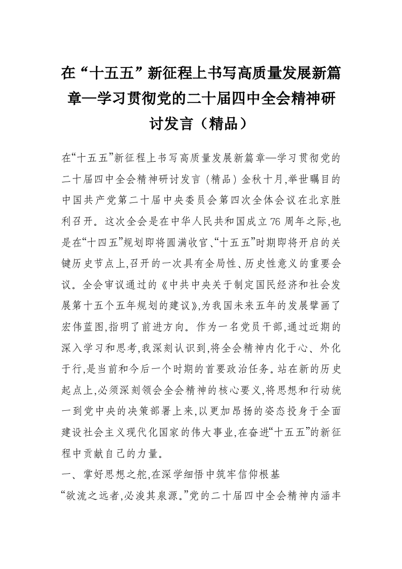 在“十五五”新征程上书写高质量发展新篇章—学习贯彻党的二十届四中***精神研讨发言(精品)