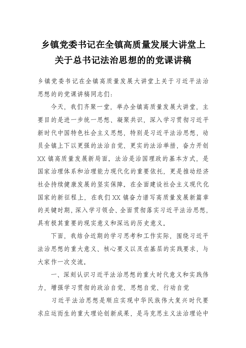 乡镇党委书记在全镇高质量发展大讲堂上关于总书记法治思想的的党课讲稿