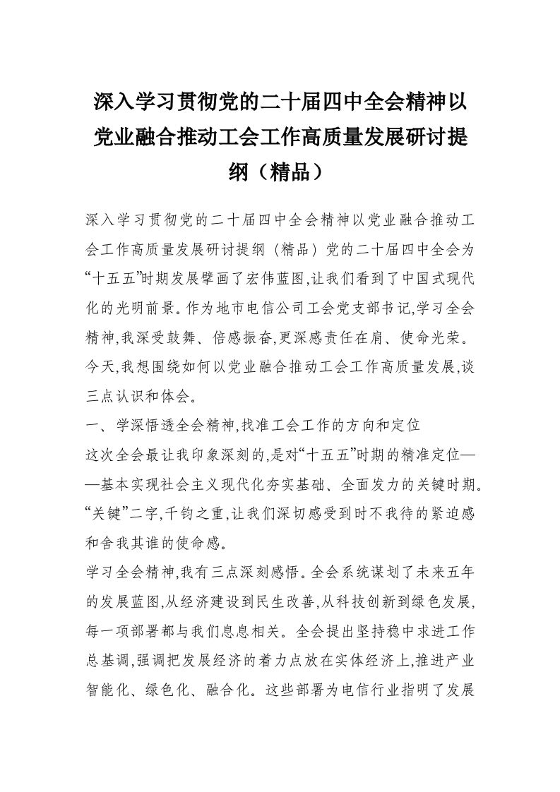深入学习贯彻党的二十届四中***精神以党业融合推动工会工作高质量发展研讨提纲(精品)
