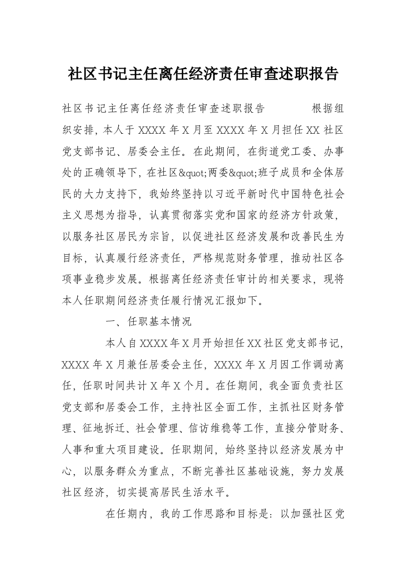社区书记主任离任经济责任审查述职报告