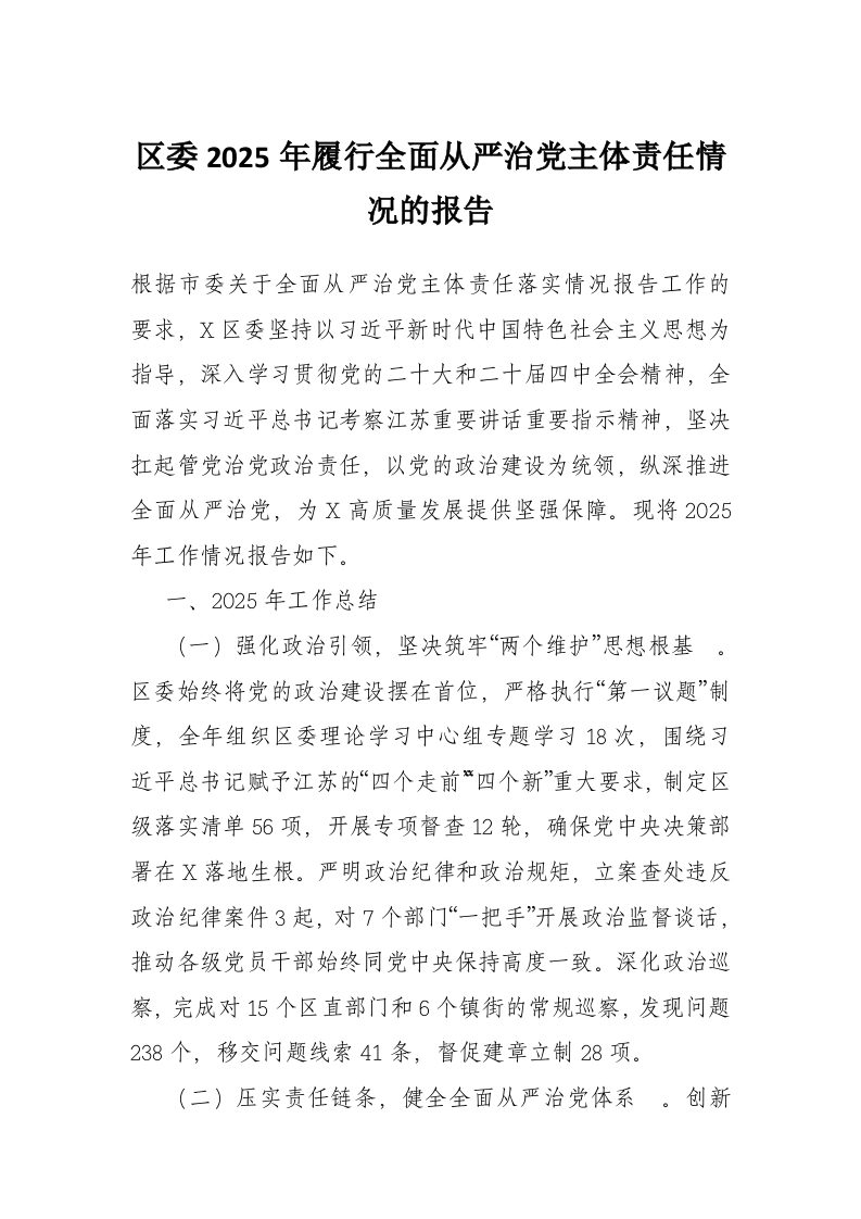 区委2025年履行全面从严治党主体责任情况的报告