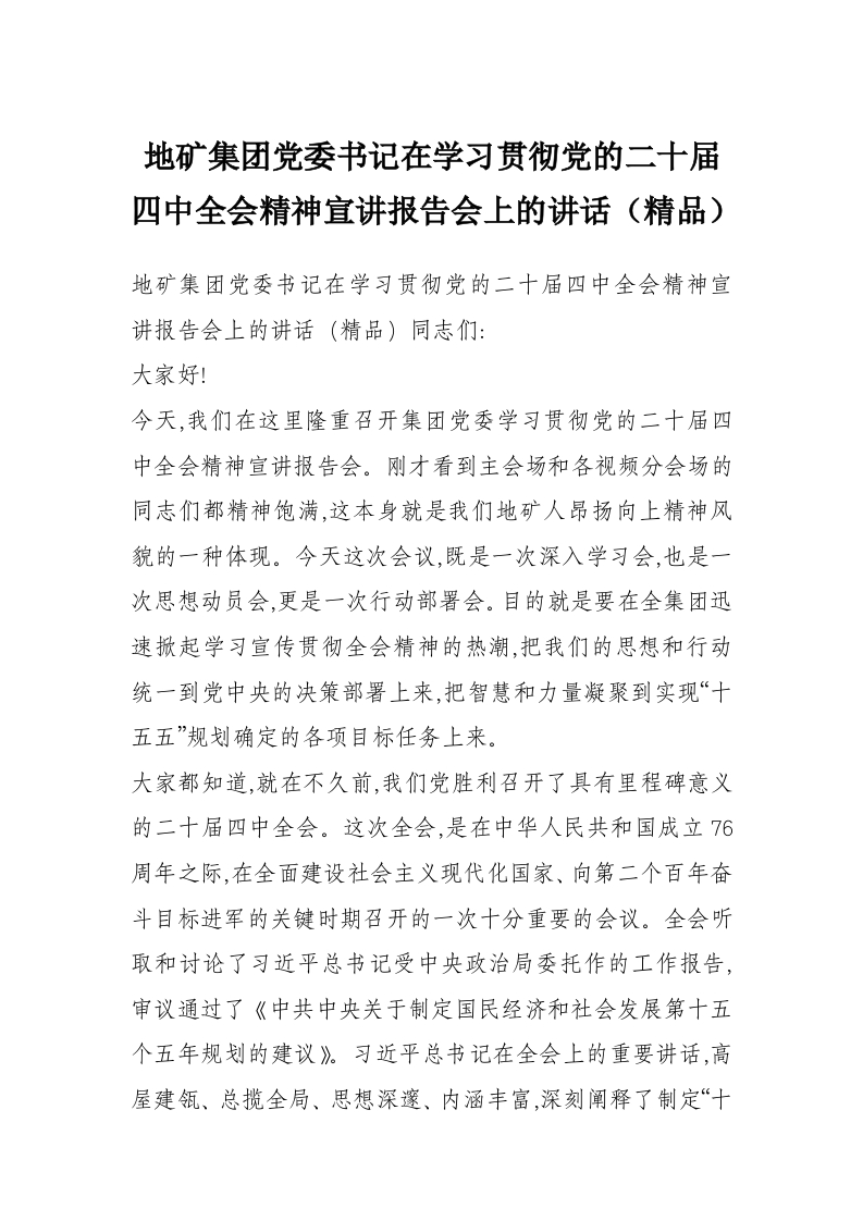 首页写作素材地矿集团党委书记在学习贯彻党的二十届四中***精神宣讲报告会上的讲话(精品)