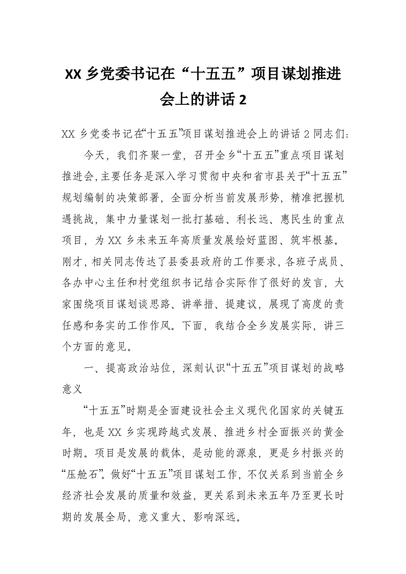 XX乡党委书记在“十五五”项目谋划推进会上的讲话2