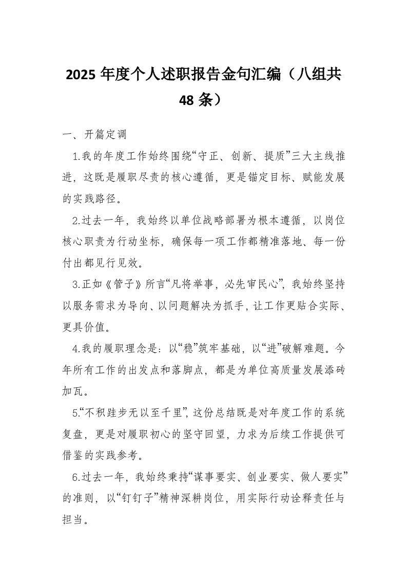 首页精选范文2025年度个人述职报告金句汇编(八组共48条)