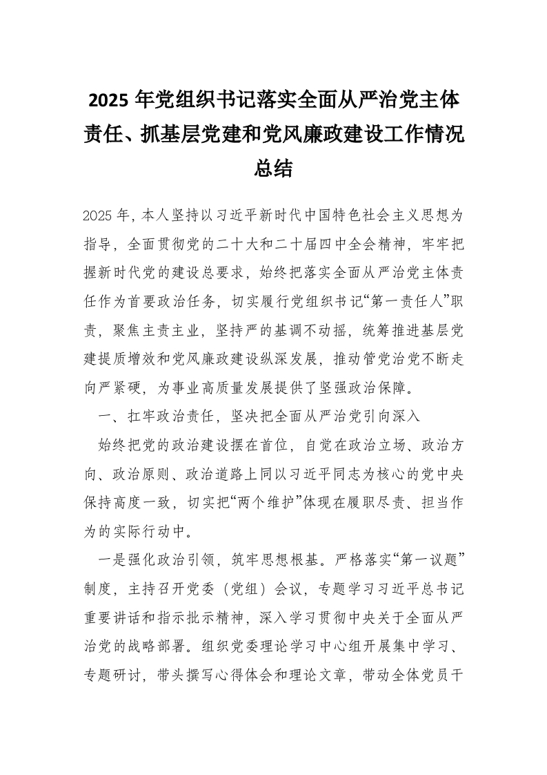 2025年党组织书记落实全面从严治党主体责任、抓基层党建和党风廉政建设工作情况总结
