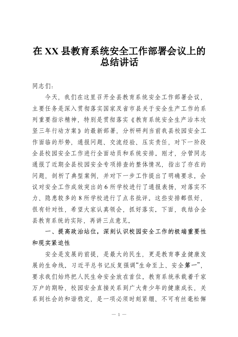 首页精选范文在XX县教育系统安全工作部署会议上的总结讲话