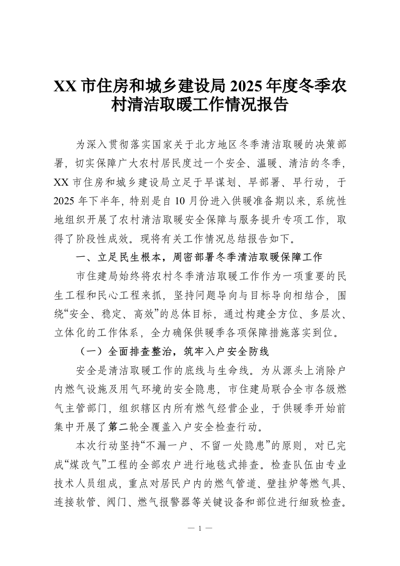 XX市住房和城乡建设局2025年度冬季农村清洁取暖工作情况报告