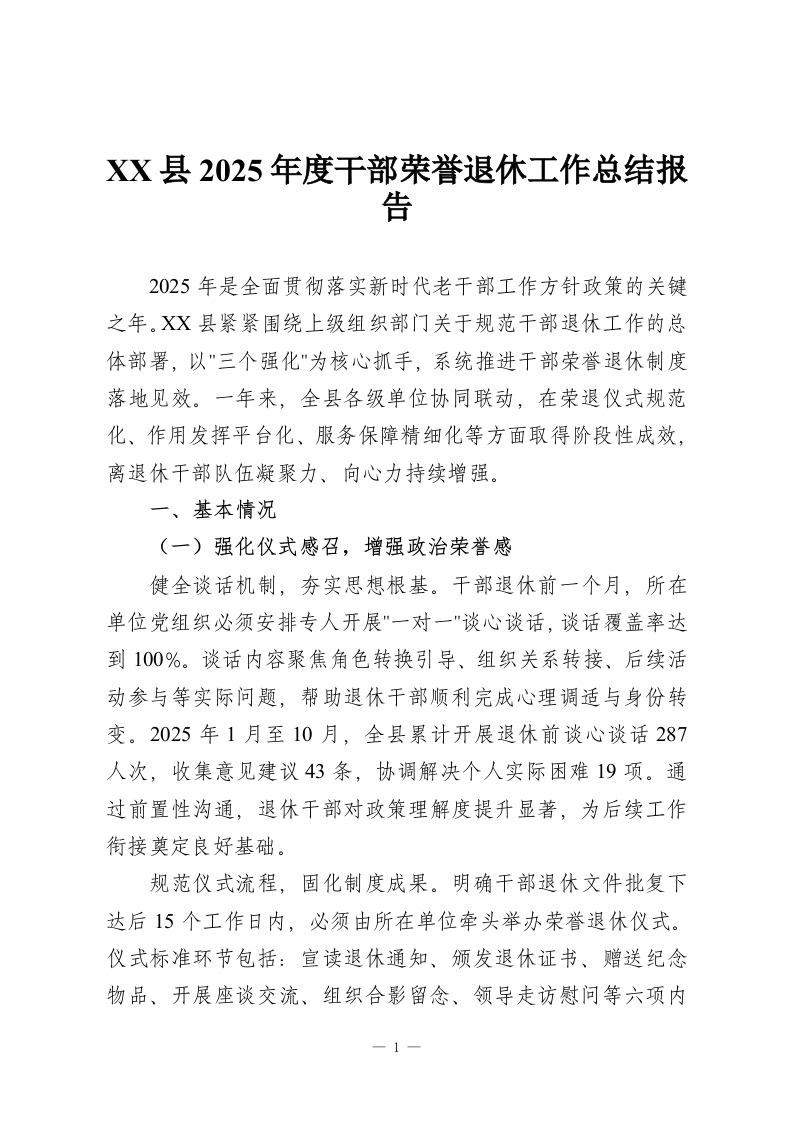 XX县2025年度干部荣誉退休工作总结报告