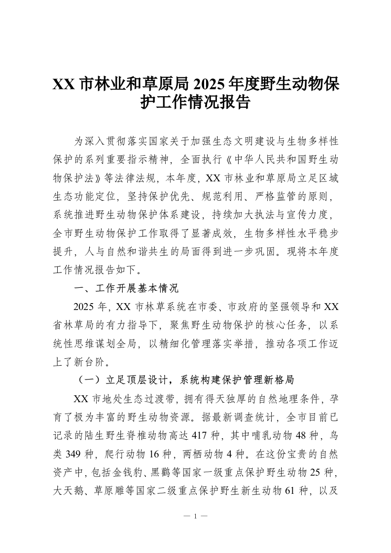 首页精选范文XX市林业和草原局2025年度野生动物保护工作情况报告
