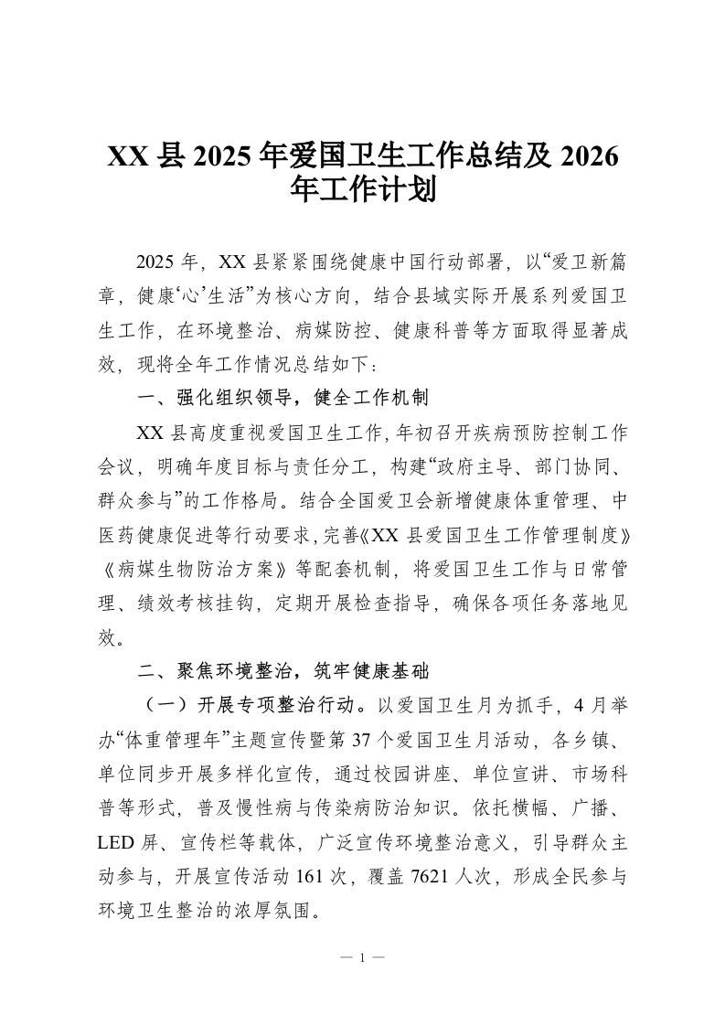 XX县2025年爱国卫生工作总结及2026年工作计划