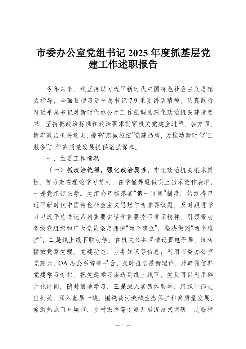 市委办公室党组书记2025年度抓基层党建工作述职报告