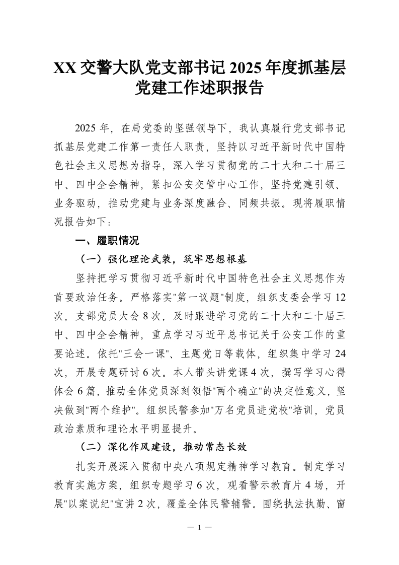 XX交警大队党支部书记2025年度抓基层党建工作述职报告