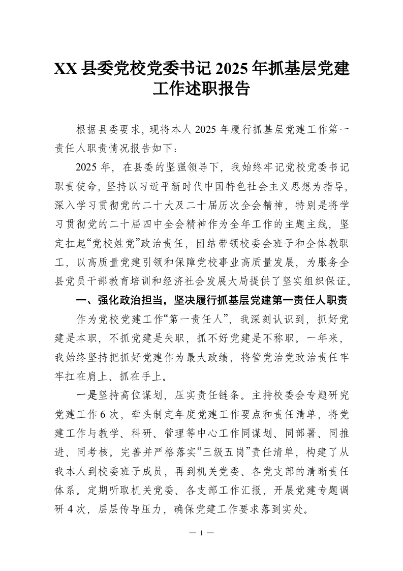 XX县委党校党委书记2025年抓基层党建工作述职报告