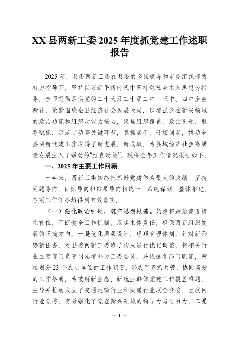 XX县两新工委2025年度抓党建工作述职报告